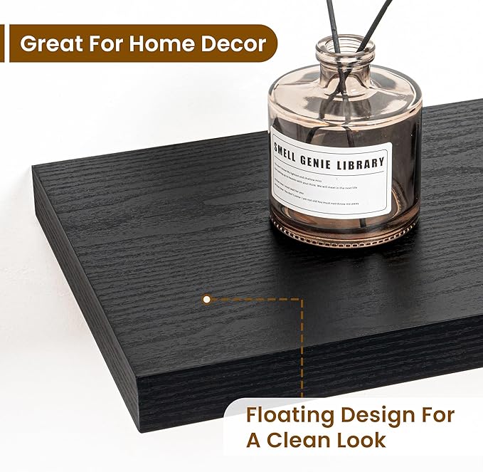 Fun Memories Floating Shelves for Wall, 24 Inch Rustic Wood Wall Mounted Shelves for Bathroom, Bedroom, Living Room, Deep Floating Shelves for Storage & Home Decor (Black, Set of 2)