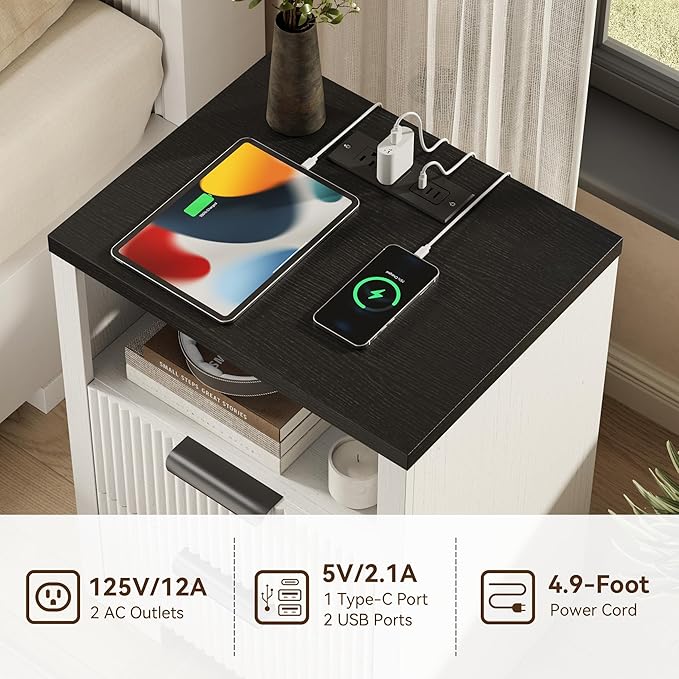 - 【Modern Nightstand with Charging Station】 This modern nightstand features a distinctive waveform panel, wide metal handles, and thickened half-covered legs that highlight its contemporary style. With 2 AC outlets, 1 Type-C, and 2 USB ports built into the top, this bedside table with charging station provides convenient power access for phones, tablets, and other electronics—perfect for keeping your devices charged overnight.
