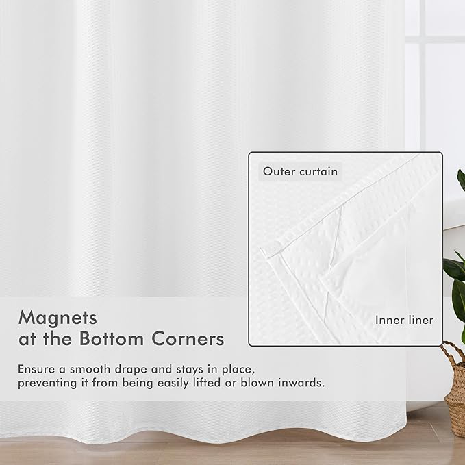 Mrs Awesome No Hook Shower Curtain with Snap-in Liner, Embossed Waffle Design Fabric Shower Curtain for Bathroom, Soft & Lightweight, 71x86, White