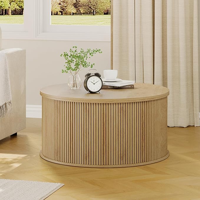 Lift Top Coffee Table, Fluted Round Coffee Table with Storage, Farmhouse Center Dining Table Circle Table for Living Room, Apartment, Home Office (Natural)