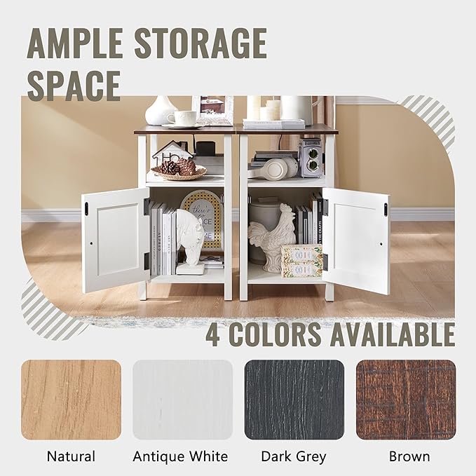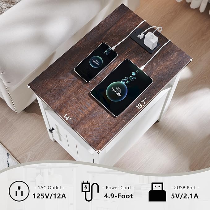 Farmhouse Nightstands Set of 2, Narrow Bedside Table with Charging Station, Night Stand Set 2 with Storage & Open Shelf, End Tables w/Groove Barn Door for Bedroom, Living Room-Antique White