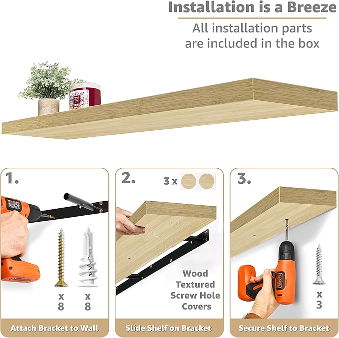 - Easy to Install: Minor assembly required, detailed instructions included. Hanging shelves are made of beautiful, engineered faux wood (not solid wood) with a smooth matte finish. Enhanced steel brackets attach firmly to the wall. Sturdy enough to hold up to 22 lbs. Mounting hardware INCLUDED. Color of bathroom shelf may be slightly different from the product photos due to lighting and screen settings