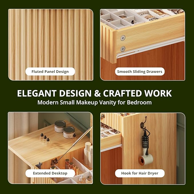FURSUN 3-in-1 Vanity with Flip Mirror & Lights, Fluted Compact Vanity Table with 3 Drawers, Storage Compartment and Rolling Stool, Modern Small Makeup Vanity for Bedroom, Powder Room, Natural Oak