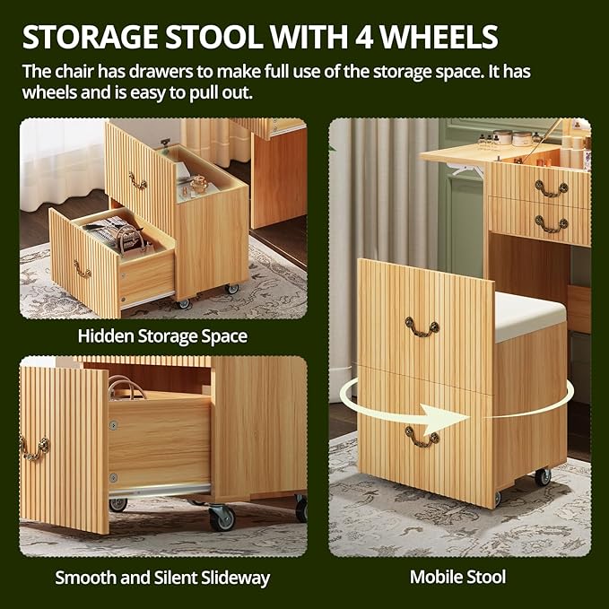 - Spacious Storage Space: The vanity includes three drawers (one top drawer and two standard drawers) plus a hidden storage compartment inside the stool. Perfect for keeping your cosmetics, jewelry, and daily essentials neatly organized