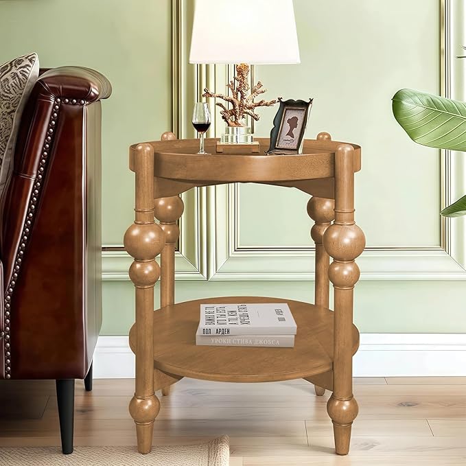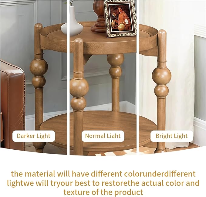 - Durability Build for Daily Use: The round side table use all-solid wood legs and reinforced crossbars ensure exceptional stability and weight-bearing capacity. The smooth real wood veneer tabletop and shelf maintain a natural wood grain finish for easy cleaning and long-lasting beauty