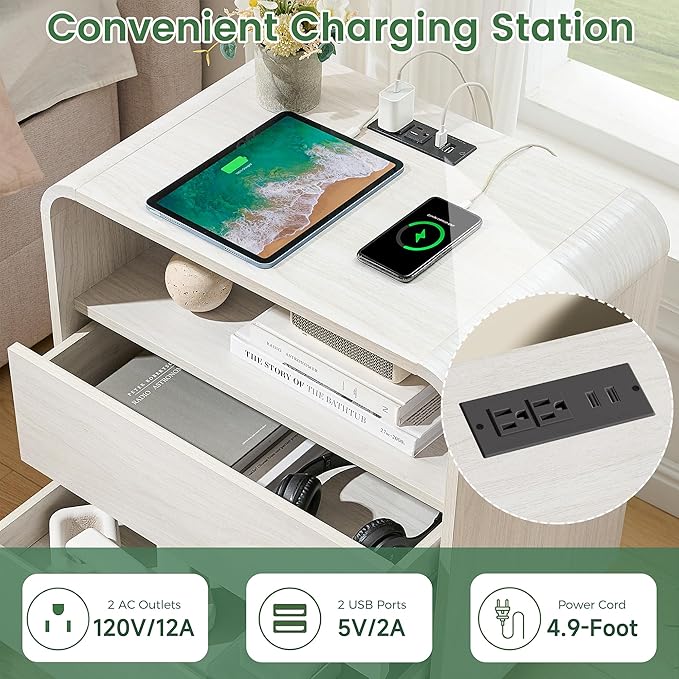 - Convenient Built-in Charging Station: This white night stand features a built-in charging station with dual USB ports and two AC outlets, keeping your phone, tablet, or laptop fully charged and within reach. A 1.5m long power cord and a cable management hole on the back panel keep wires neat and organized. Spacious desktop provides plenty of room for your essentials and favorite decorations