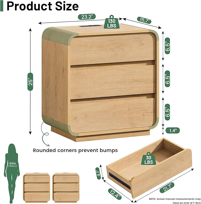 - Enhanced Safety & Stability: Our curved nightstand features four smoothly rounded corners with an anti-collision design, making it safer for families with children or seniors. Three-section thickened buffer rails ensure drawers glide quietly while preventing slips. The 1.4" reinforced base provides extra stability and load-bearing capacity, keeping this versatile nightstand, bedside table, end table, or side table safe, sturdy, and reliable for daily use