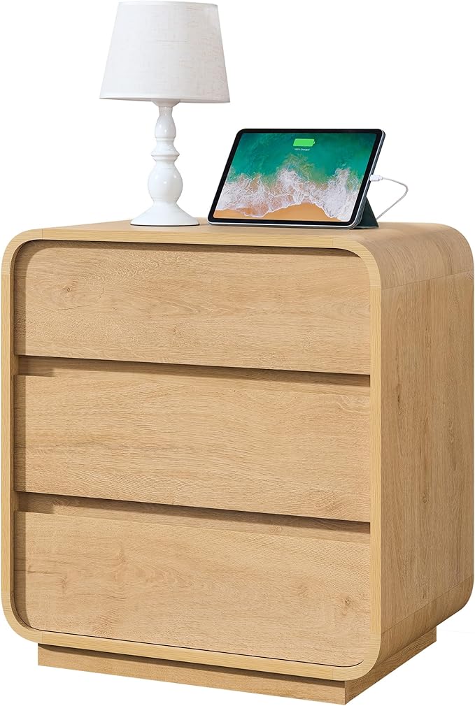 Modern Nightstand, 25" Tall Wood Bedside Table with Charging Station, 3 Drawers Dresser Side Table, Large End Table Night Stand for Bedroom, Office, Sofa, Curved Profile Design, Natural