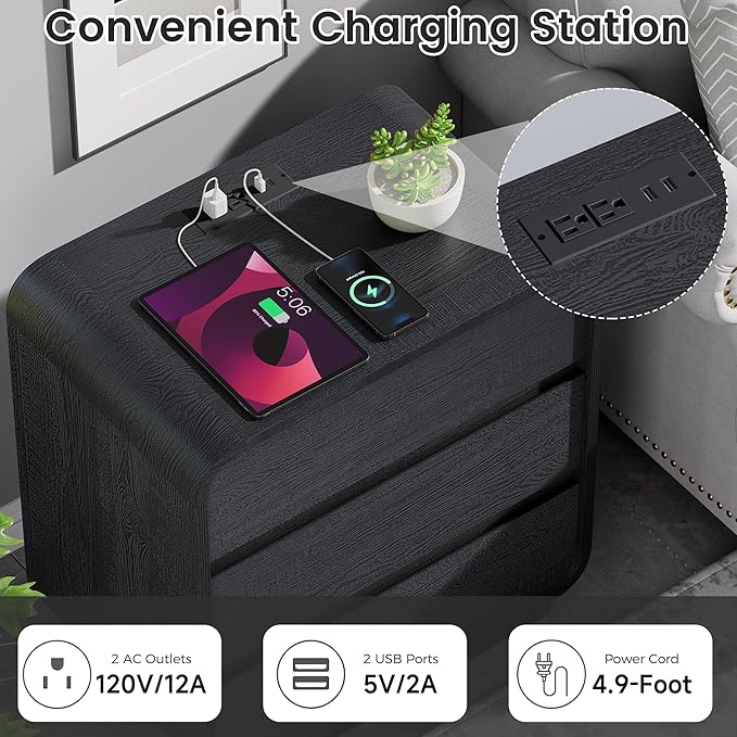 - Convenient Built-in Charging Station: This black night stand features a built-in charging station with dual USB ports and two AC outlets, keeping your phone, tablet, or laptop fully charged and within reach. A 1.5m long power cord and a cable management hole on the back panel keep wires neat and organized. Spacious desktop provides plenty of room for your essentials and favorite decorations