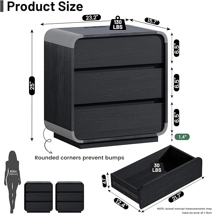 - Enhanced Safety & Stability: Our curved nightstand features four smoothly rounded corners with an anti-collision design, making it safer for families with children or seniors. Three-section thickened buffer rails ensure drawers glide quietly while preventing slips. The 1.4" reinforced base provides extra stability and load-bearing capacity, keeping this versatile nightstand, bedside table, end table, or side table safe, sturdy, and reliable for daily use