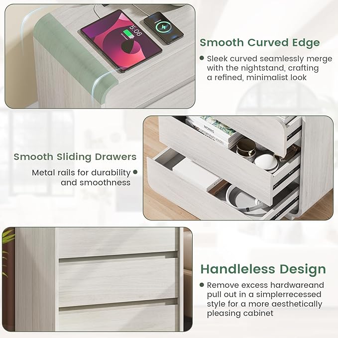 - Enhanced Safety & Stability: Our curved nightstand features four smoothly rounded corners with an anti-collision design, making it safer for families with children or seniors. Three-section thickened buffer rails ensure drawers glide quietly while preventing slips. The 1.4" reinforced base provides extra stability and load-bearing capacity, keeping this versatile nightstand, bedside table, end table, or side table safe, sturdy, and reliable for daily use