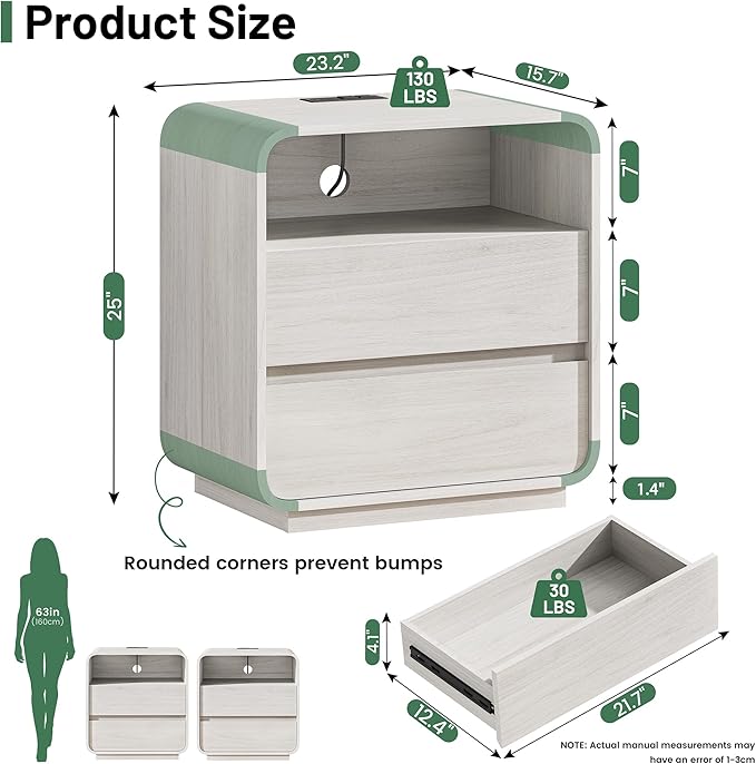 - Enhanced Safety & Stability: Our curved nightstand features four smoothly rounded corners with an anti-collision design, making it safer for families with children or seniors. Three-section thickened buffer rails ensure drawers glide quietly while preventing slips. The 1.4" reinforced base provides extra stability and load-bearing capacity, keeping this versatile nightstand, bedside table, end table, or side table safe, sturdy, and reliable for daily use