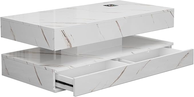 LED Coffee Table, 47.2" Coffee Tables with Storage Drawers, Smart Living Room Table with Wireless Charging & Bluetooth Speaker,Modern Center Tables for Living Room, White Marble