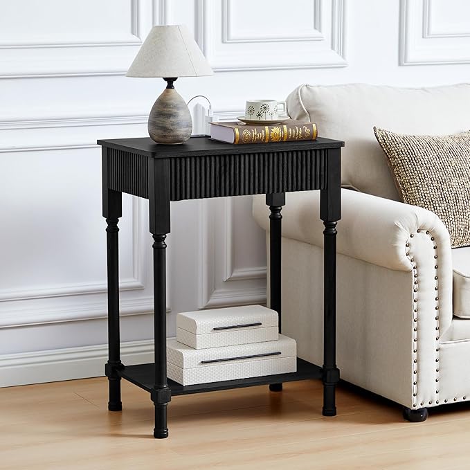 23.6” Large End Table with Charging Station, Modern Farmhouse Side Table Sofa Tables with Fluted Drawer, Wooden Bedside Table Night Stand for Bedroom Living Room Home Office, Black