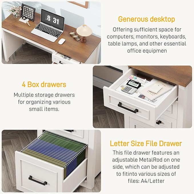 Vabches Farmhouse 49” Executive Desk with File Drawer, 4 Drawers Reversible Computer Desk with Storage, Rustic Home Writing Workstation for Home Office.White Brown