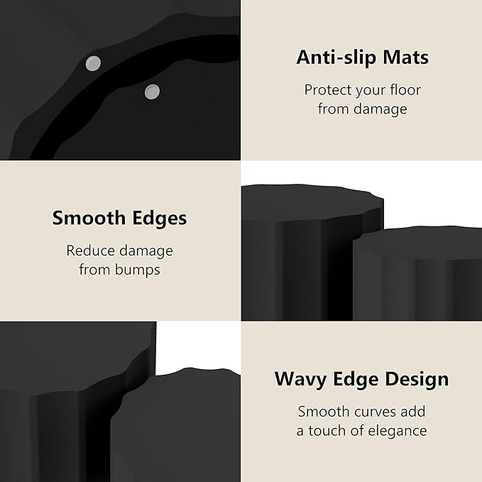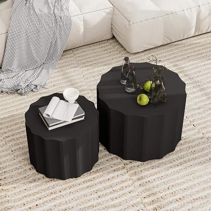 - 【Stylish Blend】Why choose between modern and industrial when you can have both? These black round coffee tables feature a wavy edge design and wood grain veneer, combining modern style with an industrial look to make a perfect coffee table set for any room.